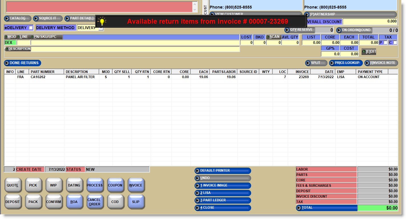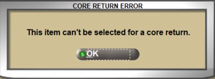 If the core part is validated against an original sale in purchase history, the “core quantity returned” is not incremented on the original sales invoice, so that, should the core be returned at a later time, the core return will be valid.