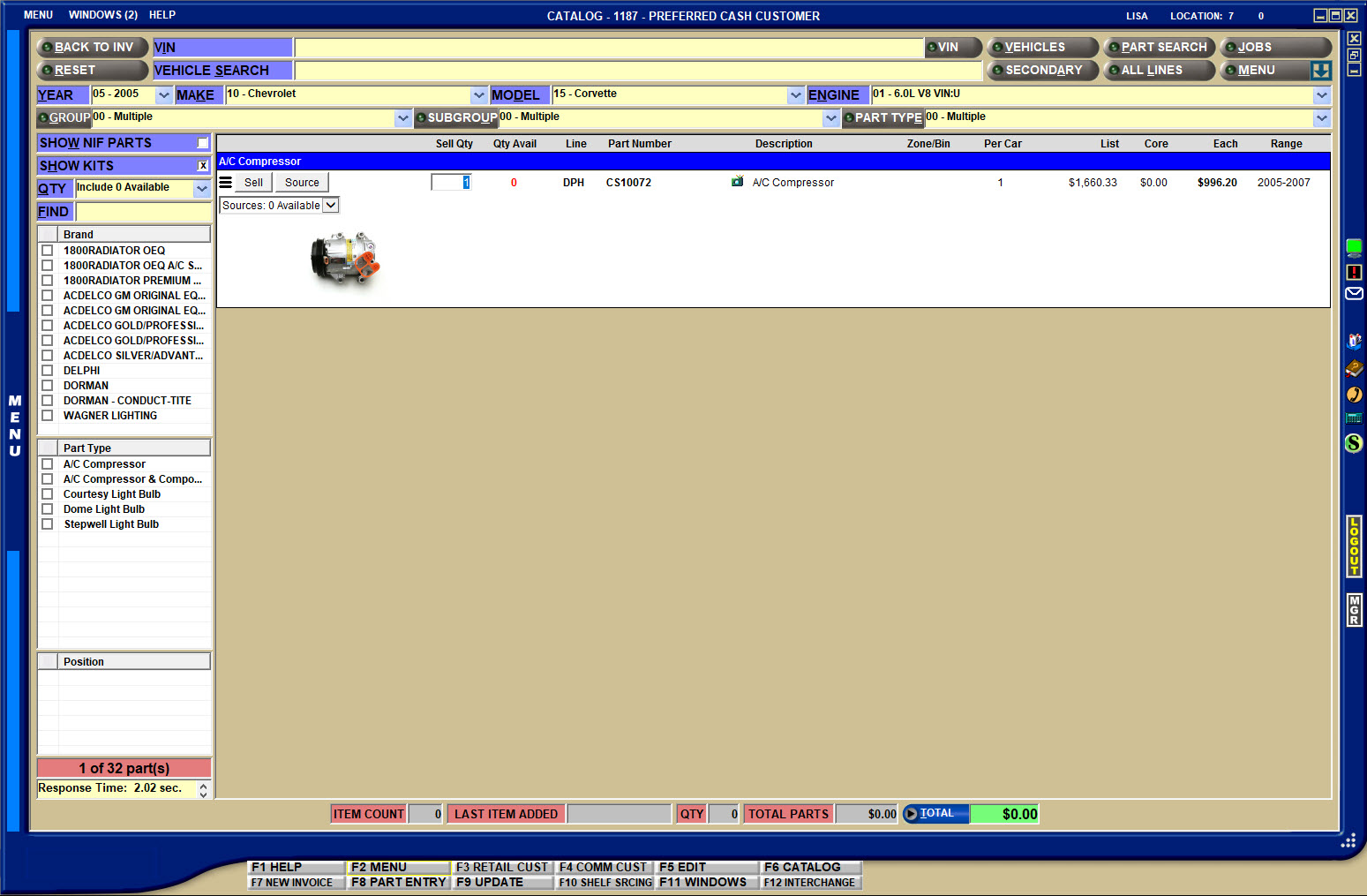 Enter the parameters for the part lookup in the CATALOG screen. The parts return.
