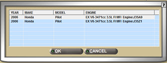 Allows entry of a Vehicle Identification Number (VIN) to look up a vehicle. Entry of a VIN with a single match populates the 'YEAR', 'MAKE', 'MODEL', and 'ENGINE' choices. Entry of a VIN with multiple matches displays a pop-up to select the desired vehicle.