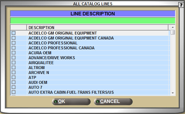 Displays the 'All CATALOG LINES' pop-up with a list of all lines that carry parts in the group/subgroup selected. Accelerator key is 'Alt' + 'L'.