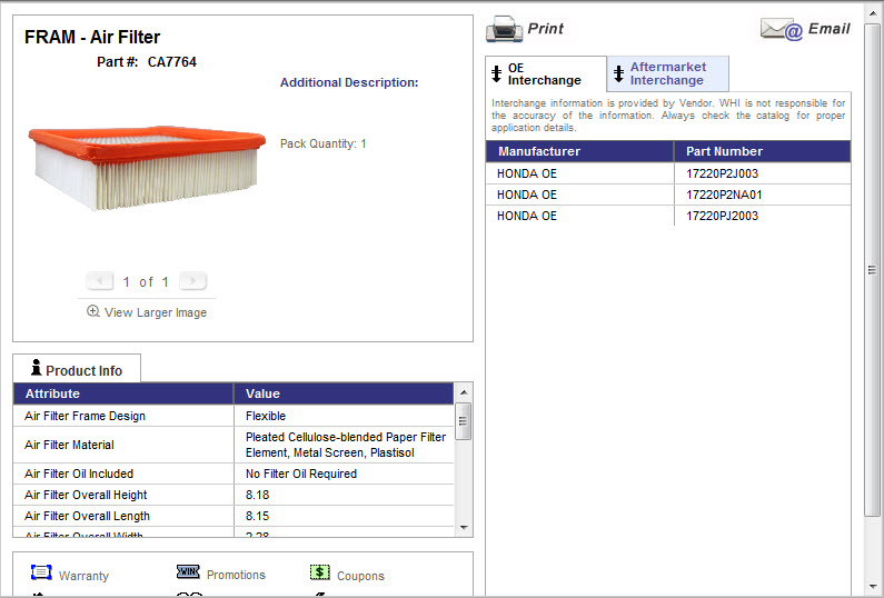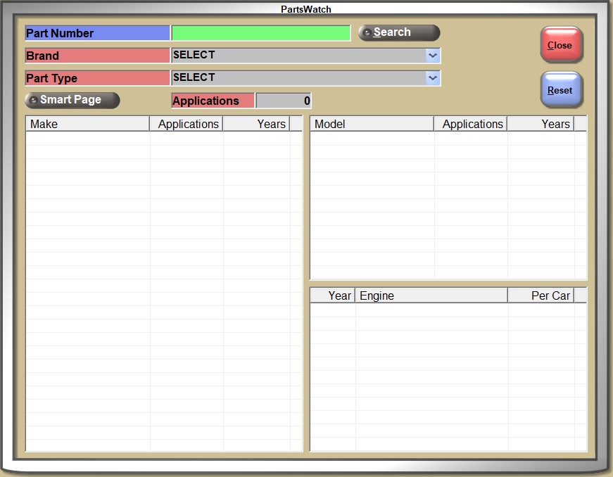 'BUYERS GUIDE' - Acts like a "reverse lookup" for catalog parts. Specify a part number, brand, or part type to obtain a list of vehicles that the specified part fits.