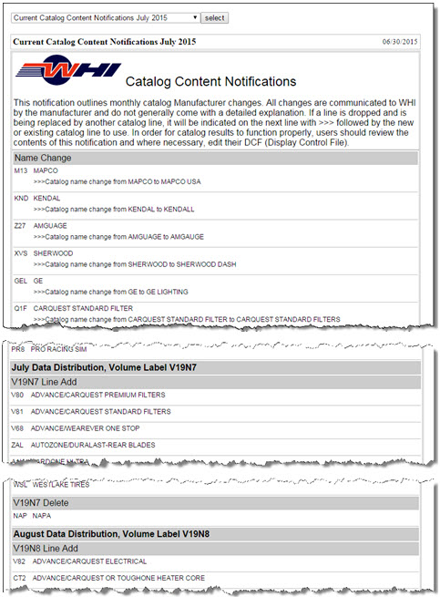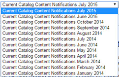 Click the 'Current Catalog Content Notifications' drop-down to view release notes from previous months. Select a month and click 'Select' to display the release notes.
