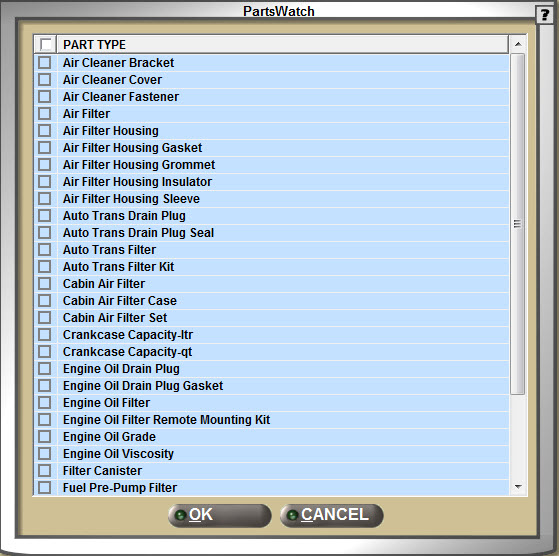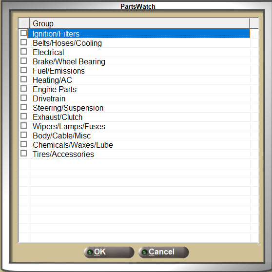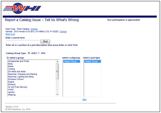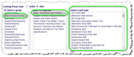 The ACES (Aftermarket Catalog Exchange Standard) Catalog is the North American Industry standard for automotive catalog applications data. PartsWatch provides access to this data at point of sale by clicking the 'CATALOG' button. The catalog is used to search for specific vehicle parts by selecting the year, make, model and engine of the vehicle, and the group, subgroup and part type of the part. ACES Catalog functionality is available during Mode 2 when the network and Catalog database servers are up but the application server is down.