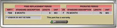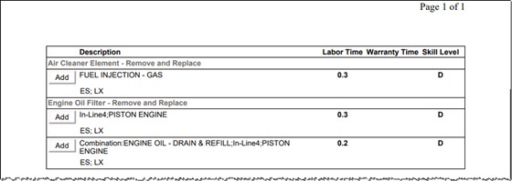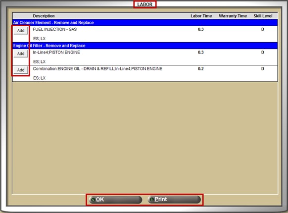 'LABOR' - Click to display the 'LABOR' pop-up for the part type returned in the catalog lookup. If multiple part types were selected, labor information is displays for all the part types. If the 'LABOR' selection is clicked before selecting the vehicle or part type, a prompt displays to request that those selections be made. If the labor catalog lookup feature is not enabled, licensed, and authorized on the catalog server, an error message displays.