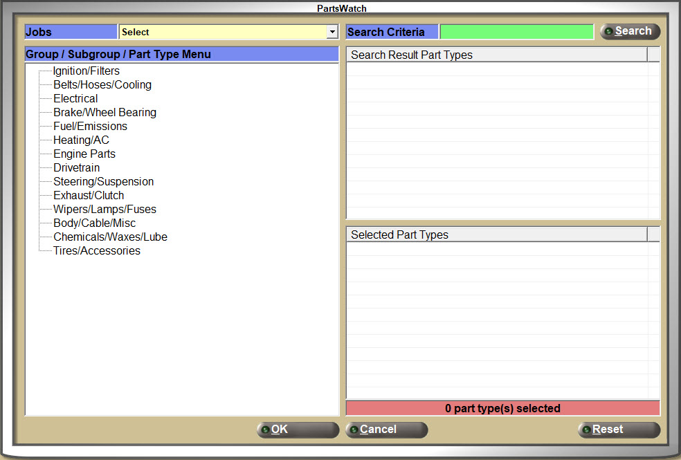 Click the 'PART SEARCH' button to display the 'Part Search' window used to do multiple searches in one session and select multiple part types regardless of the groups or subgroups they belong to, and have all resulting parts display in the CATALOG screen at one time. The 'Part Search' window has a three-level menu that allows users to select multiple Groups, Subgroups, and Part Type directly from the menu in the pop-up.