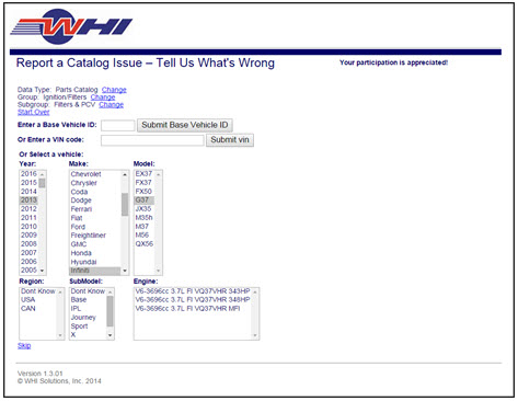 If a vehicle is looked up and the selected 'YEAR' is changed, the system attempts to look up the same vehicle for the new year (that is, the system will auto-select the make/model/engine based on the values that were selected before the year was changed). Note: Click 'RESET' to look up a different vehicle so the system does not attempt to look up the same vehicle in the different year.