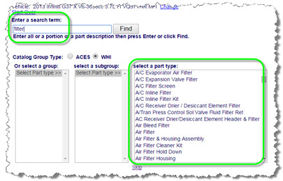 'Enter a search term:' - Enter a part description and click 'Find'. The system searches for and lists 'Part Types' containing that term.
