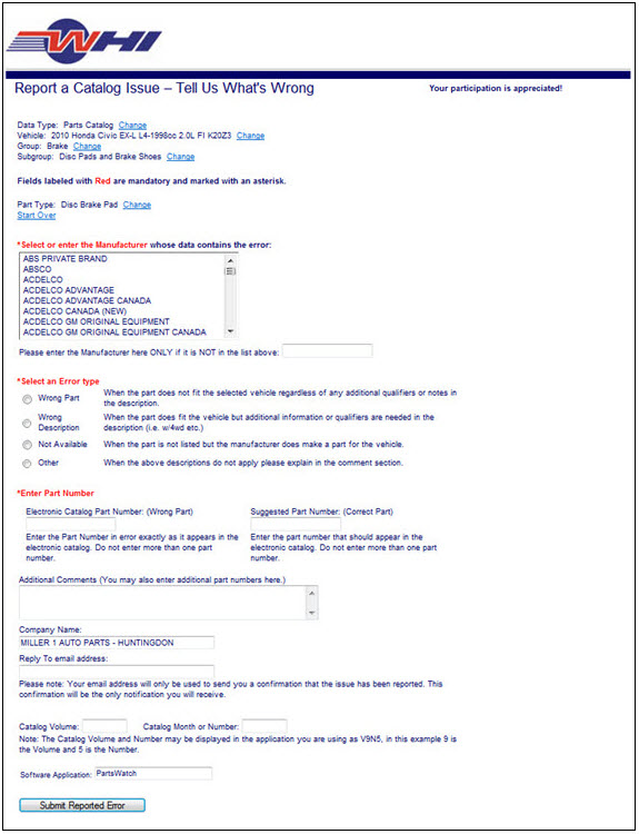 Enter the required information (in red) and click 'Submit Reported Error'.