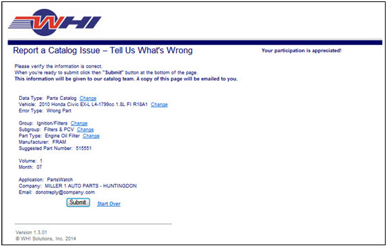 Click the 'REPORT CATALOG ISSUE' button under the 'MENU' to open a web page in the default browser to report issues found in Catalog data.