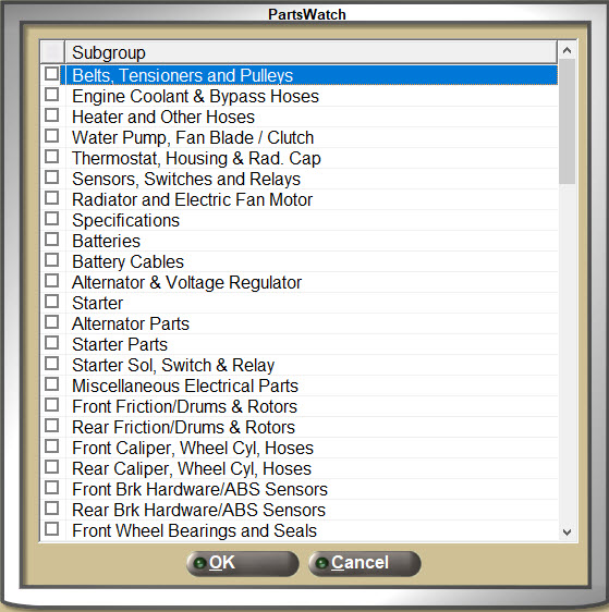 Note: If enough Groups are selected to result in 100 or more Subgroups in the Subgroup list, and digits are typed to select a Subgroup (rather than selecting with a mouse), the first Subgroup beginning with those digits will be selected. For example, if "10" is typed then Subgroup 10 will be automatically selected and the cursor will move to 'PART TYPE'. In order to select "100" the mouse is needed.