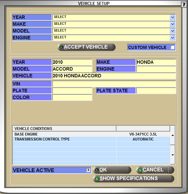 Also allows entry of a license plate (2-character state, followed by an optional space and then the plate #). If a plate is found, the VIN replaces the plate number in the field and populates the 'YEAR', 'MAKE', 'MODEL', and 'ENGINE' choices.