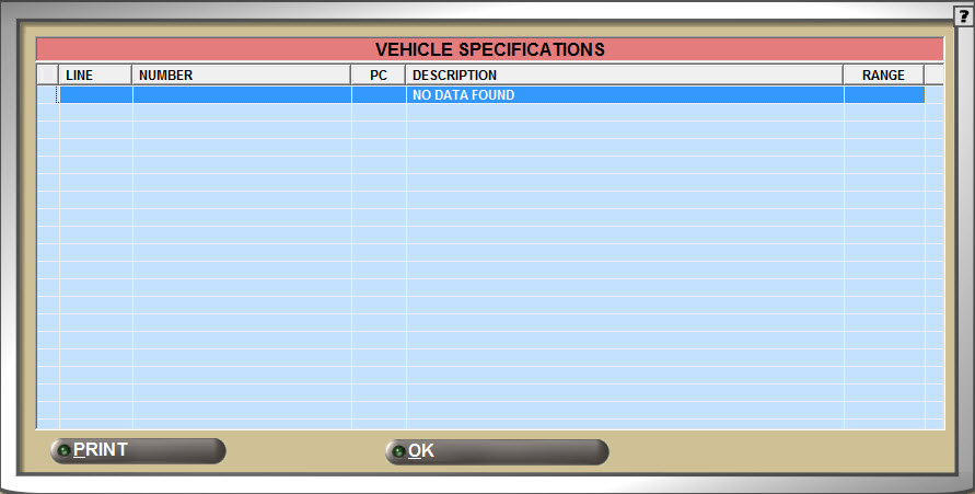 'VEHICLE SPECIFICATIONS' - Opens the 'VEHICLE SPECIFICATION' window.
