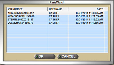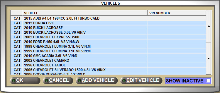 Click the 'VEHICLES' button to display the 'VEHICLES' window. The window automatically tracks the vehicles that have been looked up for a particular customer. Vehicles may also be manually added to that customer's list.