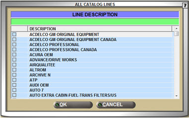 Displays the 'ALL CATALOG LINES' pop-up with a list of all lines that carry parts in the group/subgroup selected. Accelerator key is 'Alt' + 'L'.