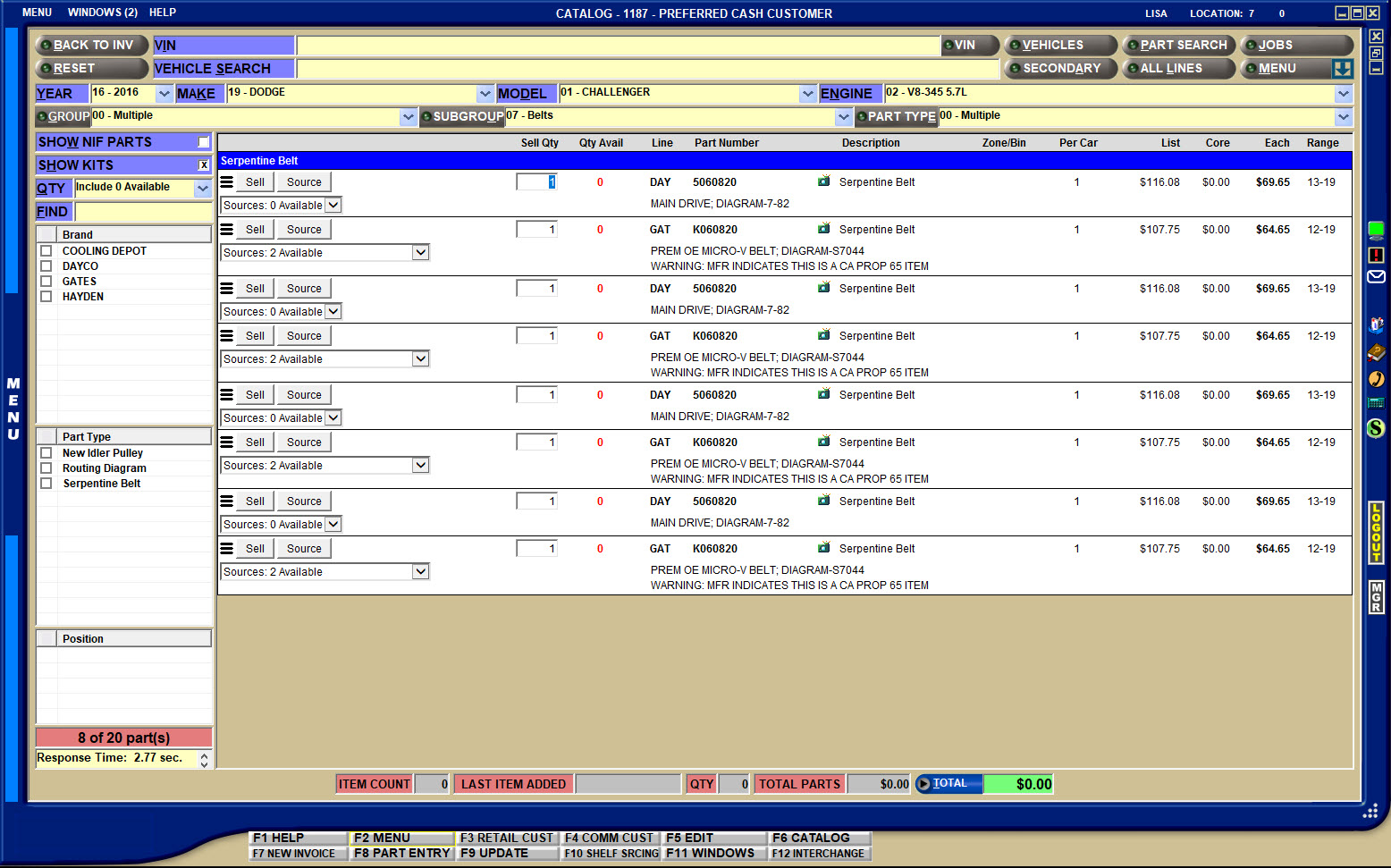 Enter the parameters for the part lookup in the CATALOG screen. The parts return.