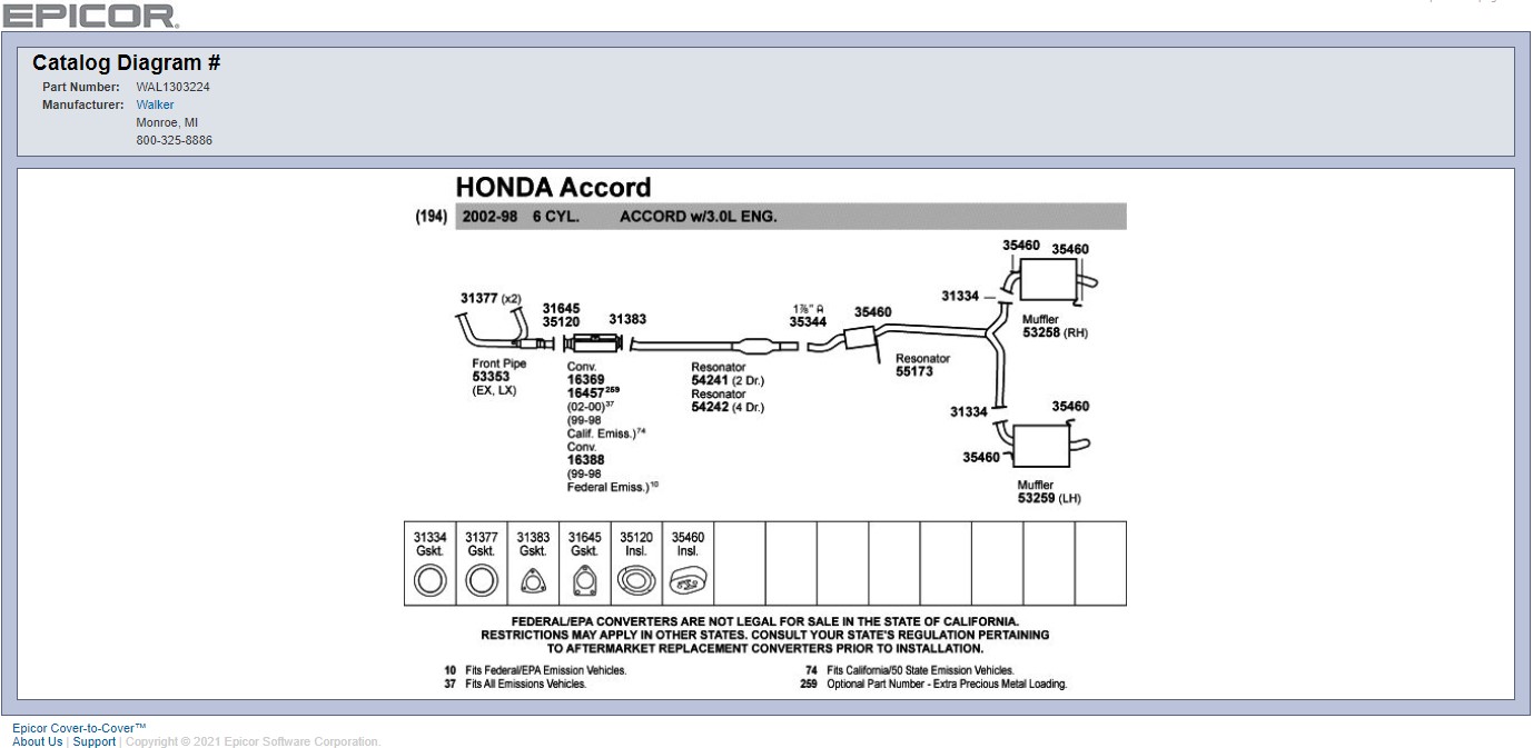 Click the camera icon, and the Epicor Cover-to-Cover diagram of the exhaust system components displays.