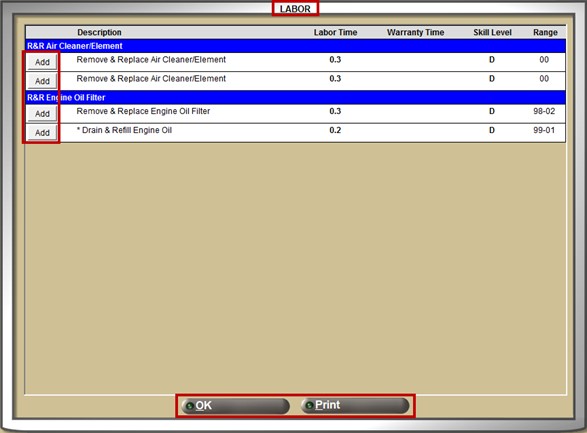 'LABOR' - Click to display the 'LABOR' pop-up for the part type returned in the catalog lookup. If multiple part types were selected, labor information is displays for all the part types. If the 'LABOR' selection is clicked before selecting the vehicle or part type, a prompt displays to request that those selections be made. If the labor catalog lookup feature is not enabled, licensed, and authorized on the catalog server, an error message displays.