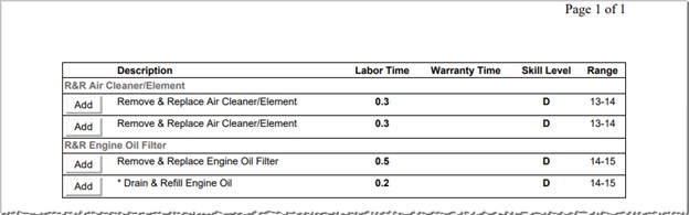 The 'LABOR' pop-up displays for the part type returned in the catalog lookup when clicked in the Catalog 'Menu'. If multiple part types were selected, labor information is displays for all the part types.