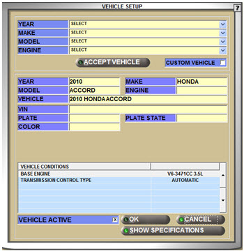 Also allows entry of a license plate (2-character state, followed by an optional space and then the plate #). If a plate is found, the VIN replaces the plate number in the field and populates the 'YEAR', 'MAKE', 'MODEL', and 'ENGINE' choices.
