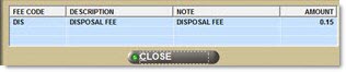 Displays the 'Fee' pop-up listing a breakout of fees, when clicked. Pop-up displays 'Fee Code' (from fees table), 'Description' (fee description from fee table, 'Note' (Fee Notes from fee table), and 'Amount' (fee amount for current item).