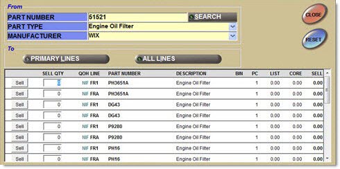 When a part is highlighted in the Catalog lookup screen and the 'Interchange' button is clicked or the 'F12' key is pressed, when the 'Interchange' window opens, the highlighted part displays in the 'Part Number' field and all resulting primary interchange parts display in the grid.