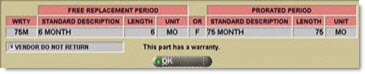 Displays a window that displays the fields from the Warranty Setup screen, for the warranty code that is set up for this part in the Part Entry screen. Also displays the 'Vendor Do Not Return' flag from the part file.