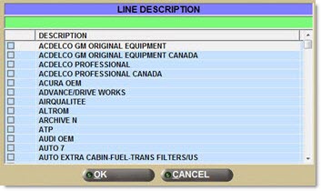 Displays the 'All Catalog Lines' pop-up with a list of all lines that carry parts in the group/subgroup selected. Accelerator key is 'Alt' + 'L'.''