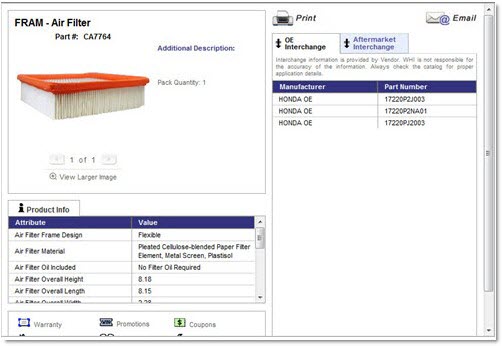 If a part in the catalog has part detail information sent with the result, a camera icon will display in the catalog results.