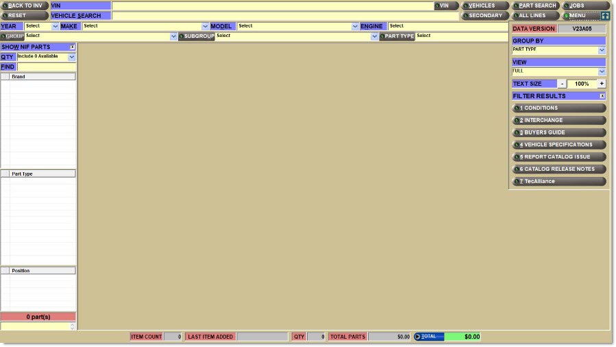The TecAlliance Catalog is a European catalog for PartsWatch's European users. PartsWatch provides access to this data at point of sale by clicking the 'Catalog' button. The catalog is used to search for specific vehicle parts by selecting the year, make, model and engine of the vehicle, and the group, subgroup, and part type of the part. TecAlliance Catalog functionality is available during Mode 2 when the network and Catalog database servers are up but the application server is down.