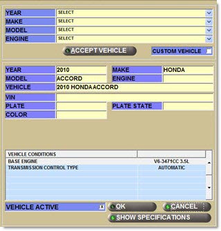 Also allows entry of a license plate (2-character state, followed by an optional space and then the plate #). If a plate is found, the VIN replaces the plate number in the field and populates the 'Year', 'Make', 'Model', and 'Engine' choices.