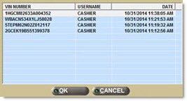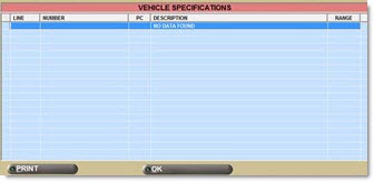 Displays the 'Vehicle' window with a list of previously viewed cars for this account, in order from most recent to older lookups. Although the button is not disabled, access to vehicle information is not available in Mode 2. The window automatically tracks the vehicles that have been looked up for a particular customer. Vehicles may also be manually added to that customer's list.