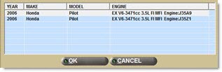 Allows entry of a Vehicle Identification Number (VIN) to look up a vehicle. Entry of a VIN with a single match populates the 'Year', 'Make', 'Model', and 'Engine' choices. Entry of a VIN with multiple matches displays a pop-up for selection of the desired vehicle.