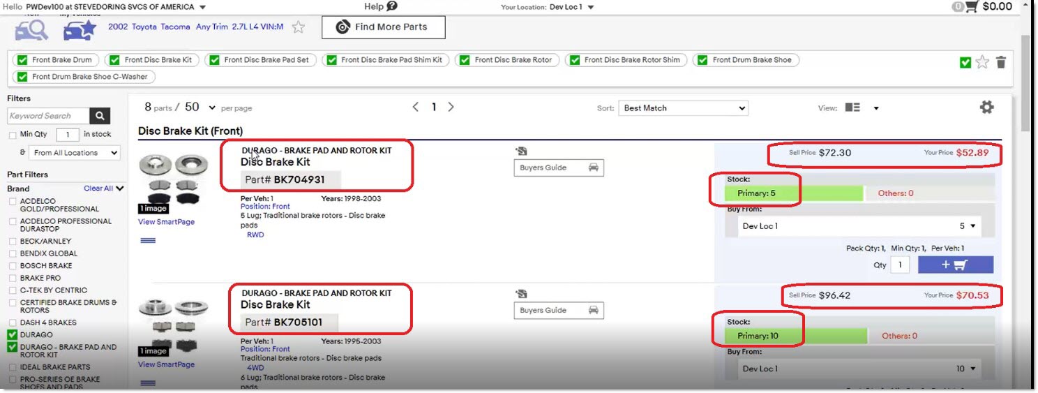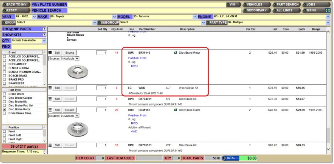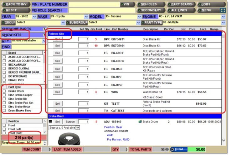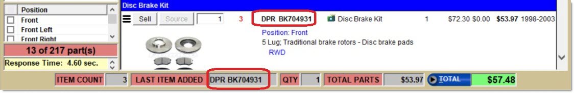 The fourth type of item is a catalog part type, used with ACES, Epicor, and TecAlliance catalog data. Using the ACES catalog, examples for a brake kit are "Disc Brake Rotor" and "Disc Brake Pad". At Point-of-Sale, either the application automatically chooses parts specific to the vehicle selected, or the user can manually select the parts from a list of available parts for that vehicle.