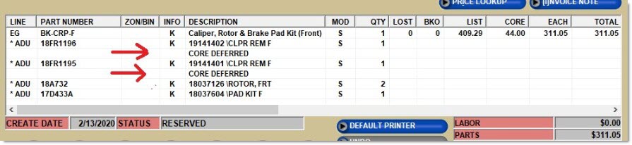 When a kit is sold to a DCB customer, and one or more components has a core charge, and the 'Print Components On Invoice' option is checked, the application displays the "CORE DEFERRED" note below the component that has the core charge (and not below the kit part).
