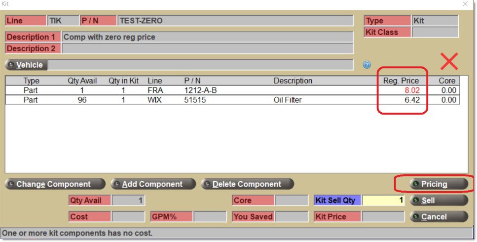Click the 'Pricing' button and view the 'Kit Price' compared to 'Reg. Price', the 'Cost', and the 'GPM%' for each kit component.