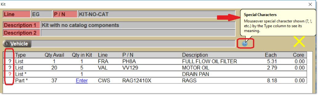 Hover over the blue question mark help icon to display the following text: "Mouseover special character shown (?, !, etc.) by the Type column to see its meaning." Mouse-over any of the large special characters by the 'Type' column to see what is going on with the kit, and whether or not it is ready to be sold, or needs some other data entered. In the image above, the special character is the Green Checkmark, indicating the kit is ready to sell!