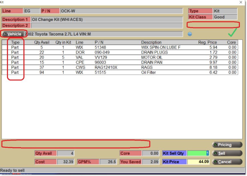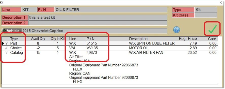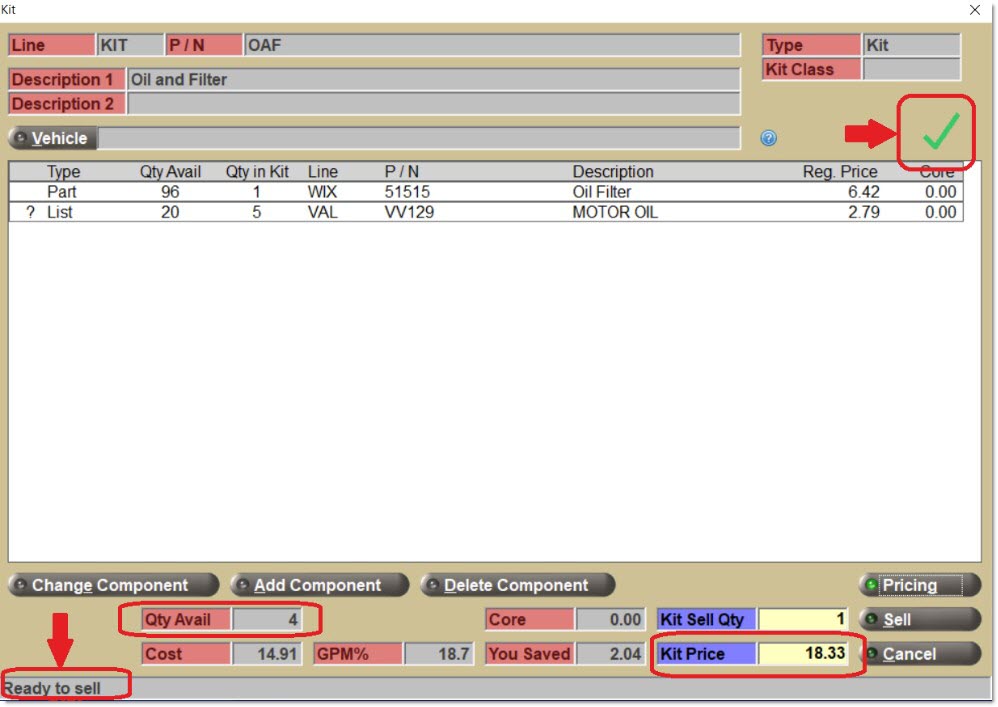 A graphical image character (in a green, yellow, or red color) displays at the top right of the pop-up that quickly indicates whether the kit is "ready to sell". "Ready to sell" (indicated by a green-colored checkmark) means that there is a part selected for each kit component within the kit, there is a 'Qty in Kit' for each component, and the kit price is not zero.