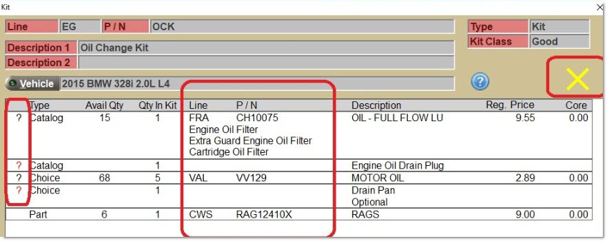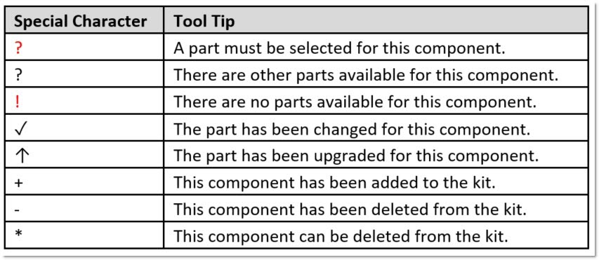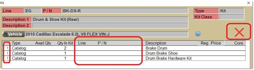 A red exclamation point character (!) displays in the first column in the grid for a component when there are no parts that can be selected for that component. In this situation, the KIT cannot be sold without first deleting those components. In the sample below, this condition is true for all three components and therefore, the Kit cannot be sold to any customer for this vehicle:
