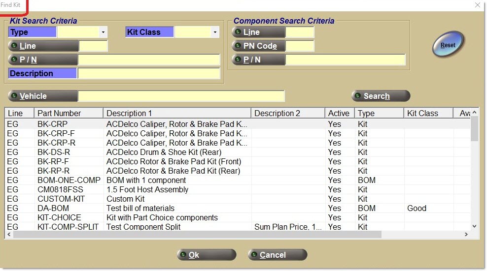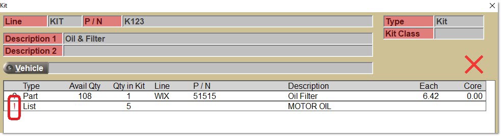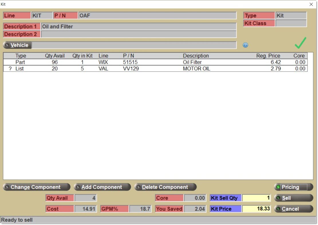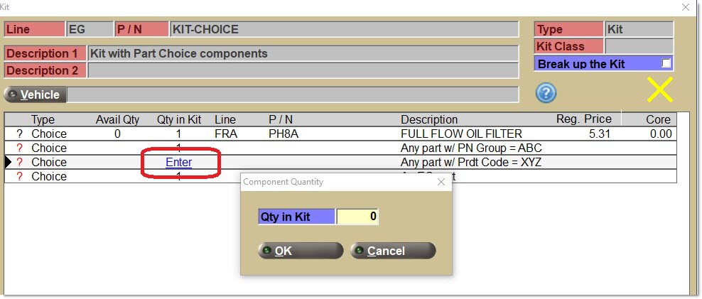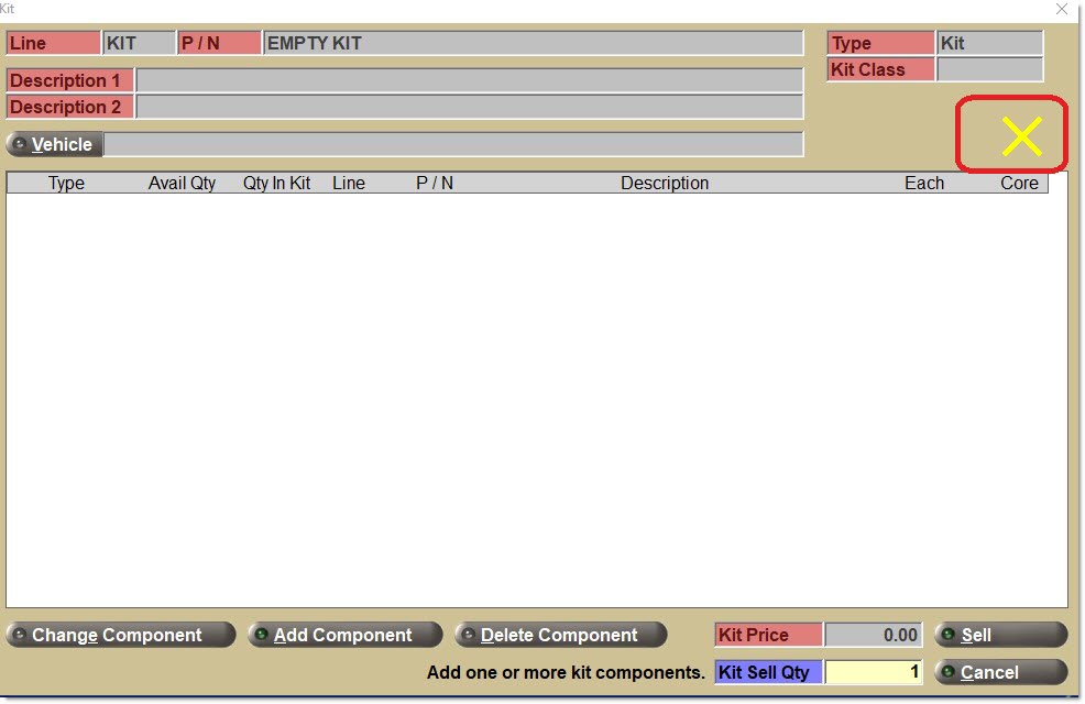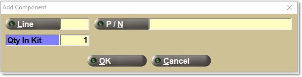 Enter a kit 'Line' and/or 'Part Number' on the sell line. If found, this entry opens the 'Kit' pop-up.