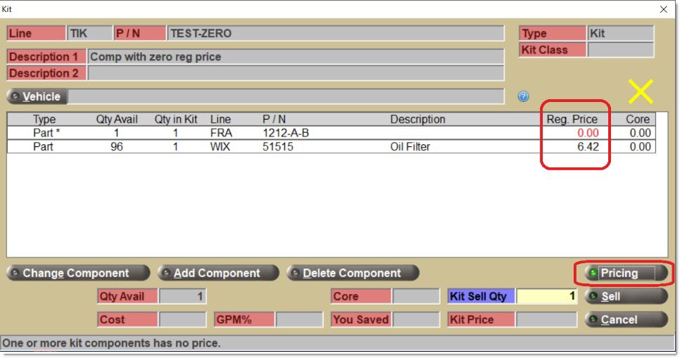 - Note that all of the core and pricing information for the KIT part displays but no pricing information for any of the components.