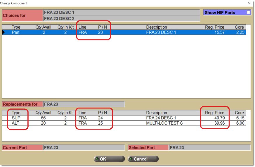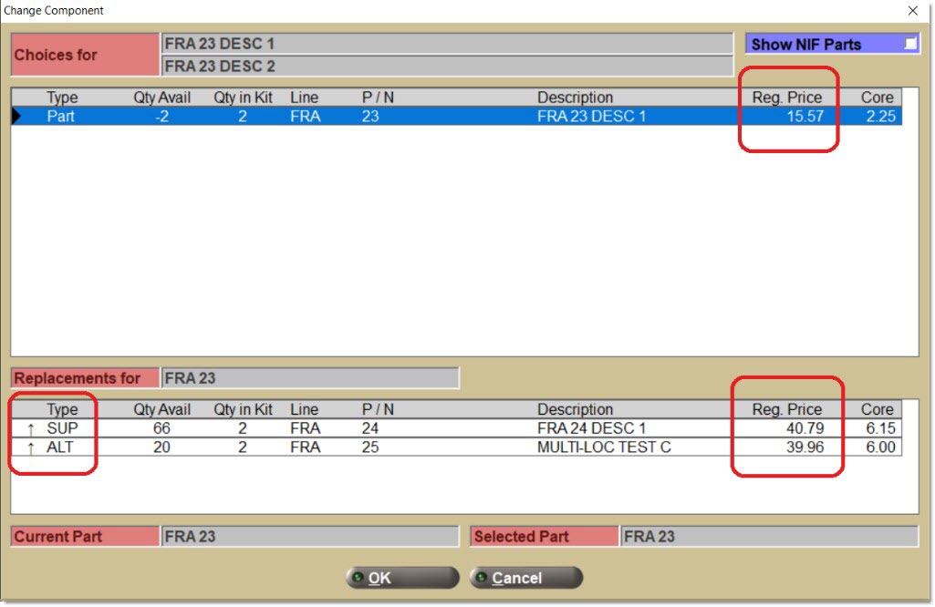 Optionally display a replacement parts pop-up if a part on the sell line is entered that is also a component within one or more BOMs or KITs.
