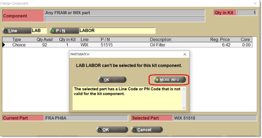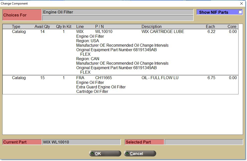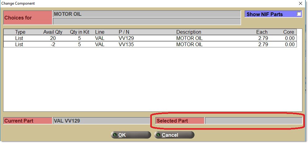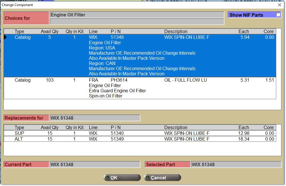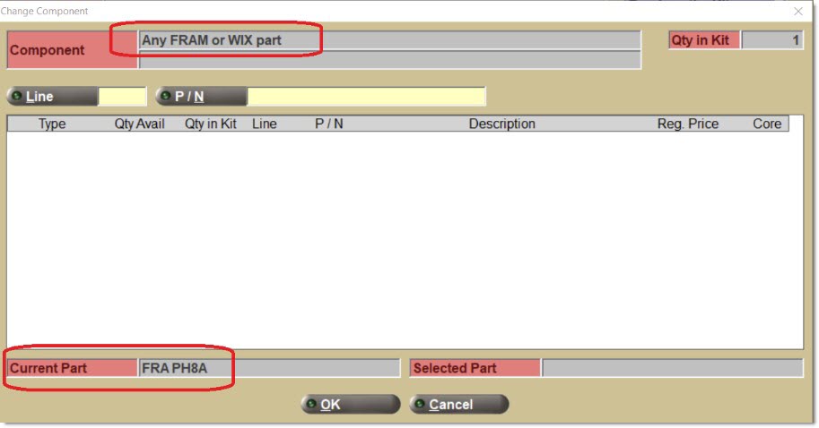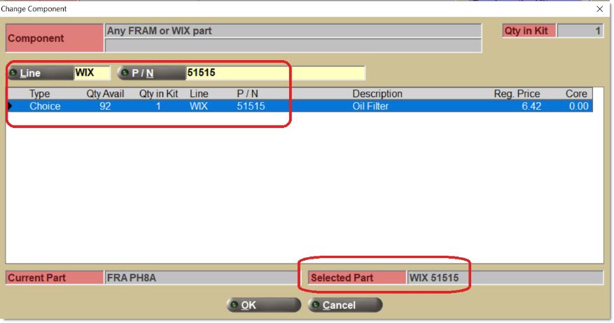 The third type of item is a part choice. A set of criteria that defines a "family" of part numbers (e.g. all "heater hoses" in the GAT line). Pre-define a default part number and still select any part number within the "family" at Point-of-Sale.