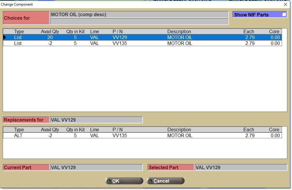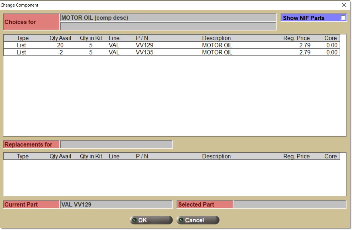 Another type of item is a part list. A list of part numbers. An example for an engine KIT is a rod bearing. At setup, several rod bearing part numbers are added to the list for the different sizes required (e.g. STD, .50MM, .75MM). At Point-of-Sale, select the appropriate part number for the size required for the customer.