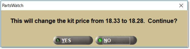 Select a kit part on a sales order and the kit will return to the 'Kit' pop-up. Once on the 'Kit' pop-up, the 'Kit Sell Quantity' or 'Kit Price' can be changed. However, the components cannot be changed. When the 'Kit Price' is changed to a "fixed amount", the 'GPM%' of the part components will now be the same as the kit's 'GPM%' except when the kit's 'Pricing Rule' is "Sum Plan Price".