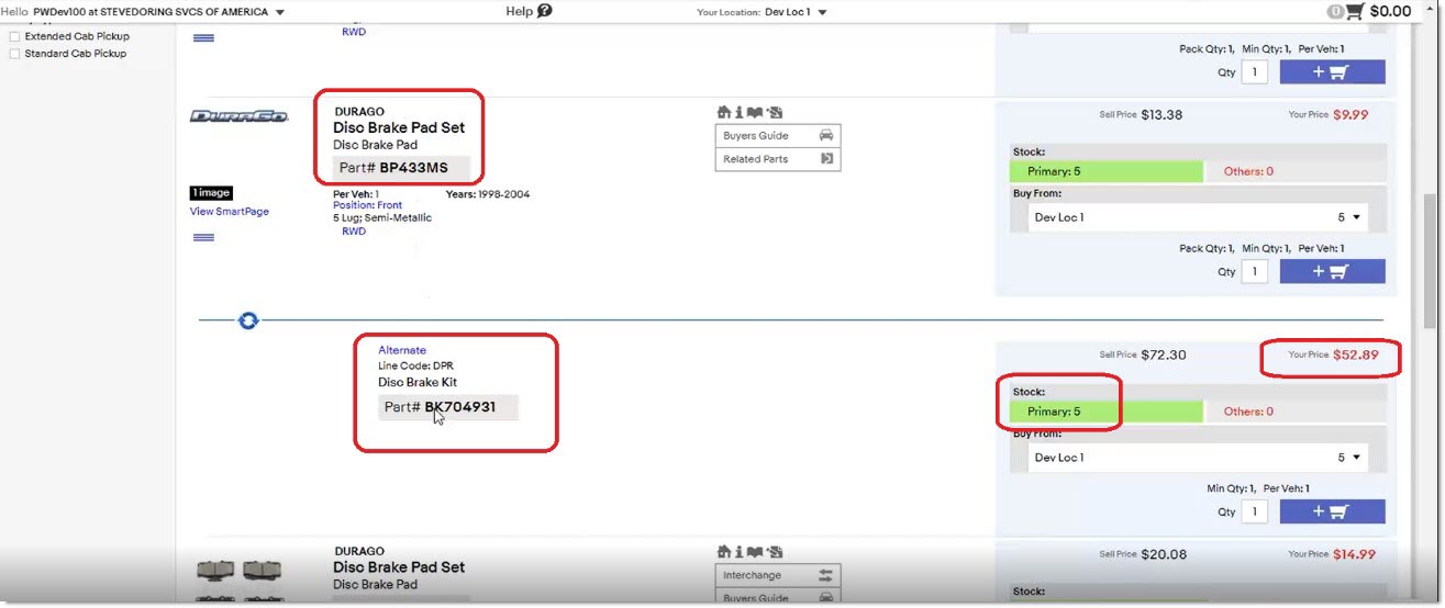 If the catalog result set returns an alternate part that was set up as a user-created kit part, the application displays any pricing and availability for the kit part. Note: The user-defined kit is not really an "alternate" for the part, but this feature of "displaying alternates in catalog results" is here so that user-defined kits can be viewed on eCommerce websites.