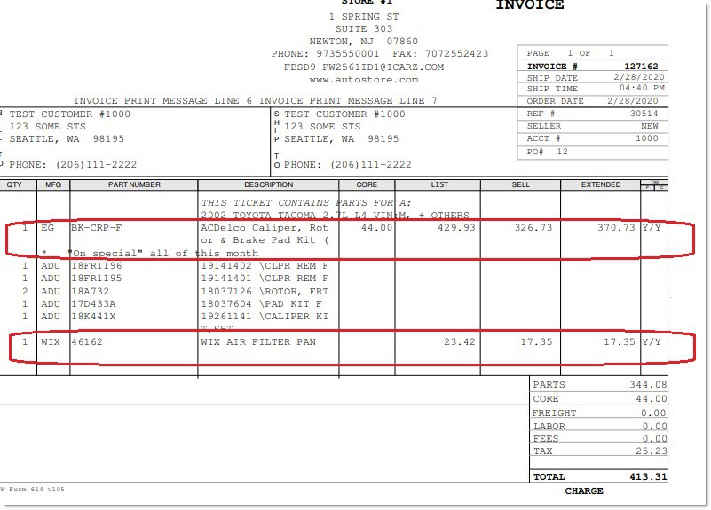- Note that for components, the invoice also displays the line, part number, and part description.