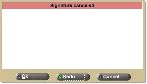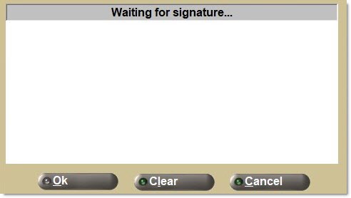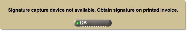 Should the terminal be set up with a signature capture device and the device is missing or malfunctioning, the system prompts that the device is not available. 'Ok' outputs the invoice without attempting to capture the customer's signature.