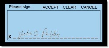 The Topaz signature pad informs the customer to sign with the selection of 'Accept', 'Clear', and 'Cancel'.