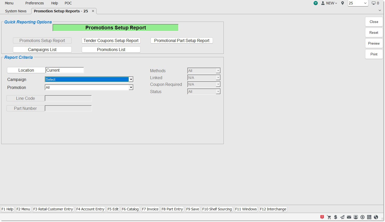 The PROMOTIONS SETUP REPORTS screen is used to report promotional setup information when needed in order to assist counter-persons in explaining the sell price of promotional pricing at Point-of-Sale.