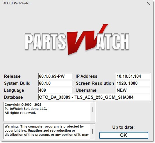 Menu Path: Upper-right border Help, About PartsWatch